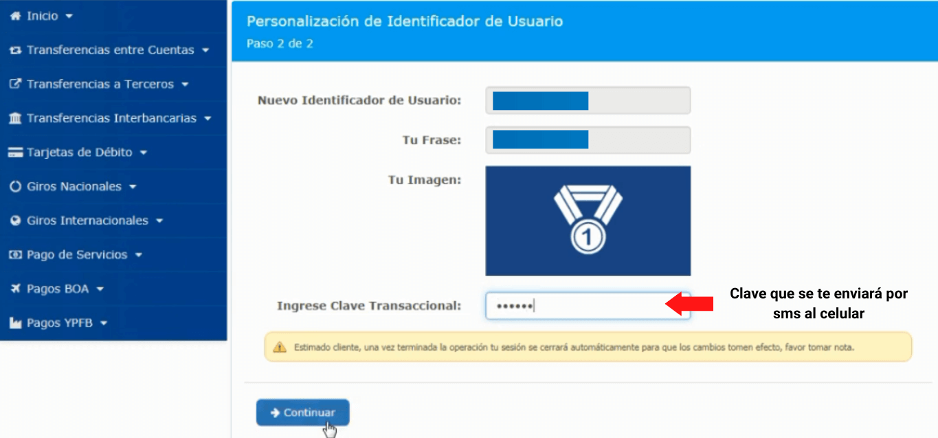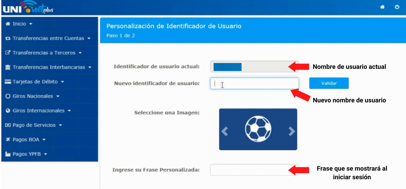 Lo que debes llenar es el nombre de usuario actual, es decir, el que te dieron en el banco, posteriormente ingresar el nuevo nombre de usuario, también debes seleccionar una imagen y una frase con la cuál te identifiques, tanto la imagen cómo la frase las podrás observar cuando inicies sesión nuevamente.