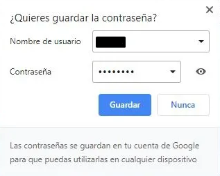En el navegador Chrome, después de hacer clic en «Iniciar sesión», verá una opción para guardar la contraseña. Se recomienda no guardar la contraseña en el navegador, nunca debe hacer clic en esta opción.